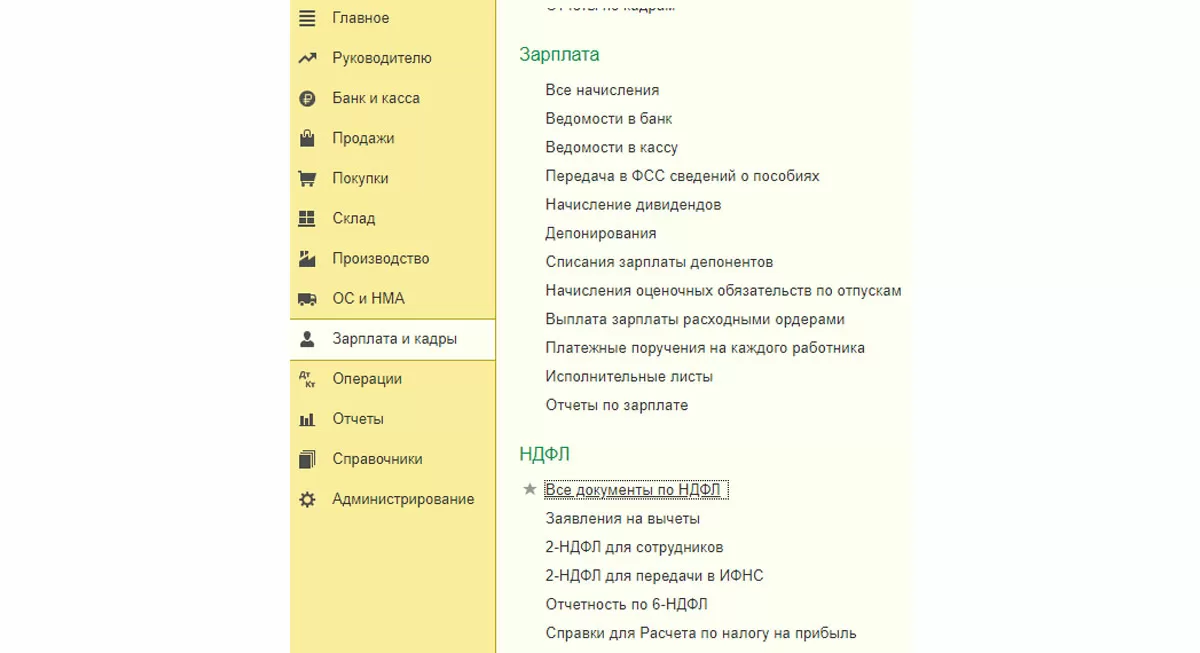 Рассмотрим, как отразить в программе 1С эту сумму. В главном меню выбираем «Зарплата и кадры» – «НДФЛ» – «Все документы по НДФЛ».