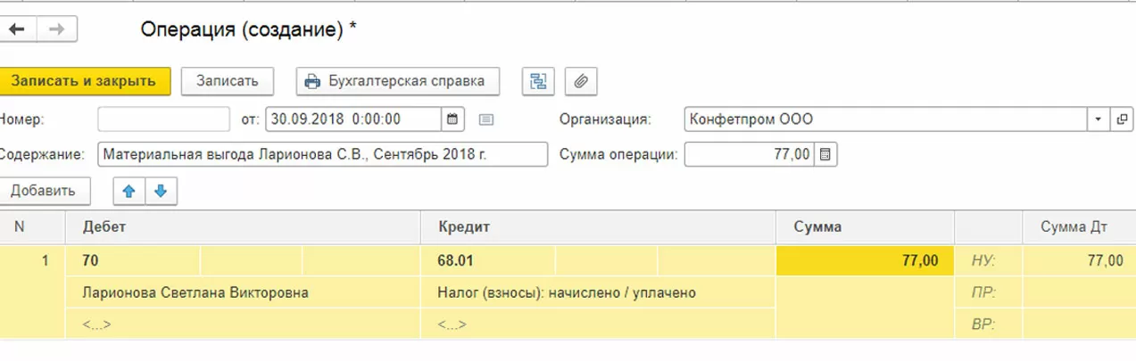 Операция учета НДФЛ также не создает бухгалтерские проводки, поэтому, чтобы отразить удержание НДФЛ с материальной выгоды, снова создаем документ «Операция, введенная вручную». Из главного меню заходим в «Операции» – «Бухгалтерский учет» – «Операции, введенные вручную». Создаем проводку Дт 70 - Кт 68.01 Удержан из зарплаты НДФЛ с материальной выгоды.
