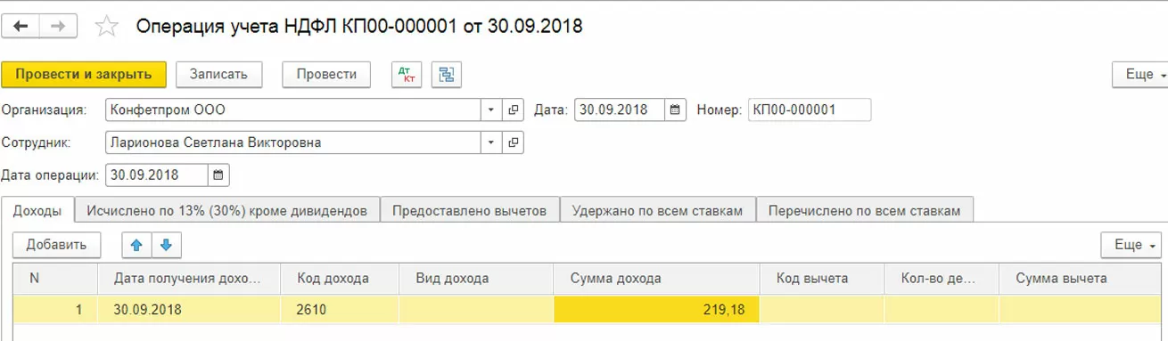 Таким образом, возвращаясь к нашему примеру, рассчитаем НДФЛ с материальной выгоды сотруднику: