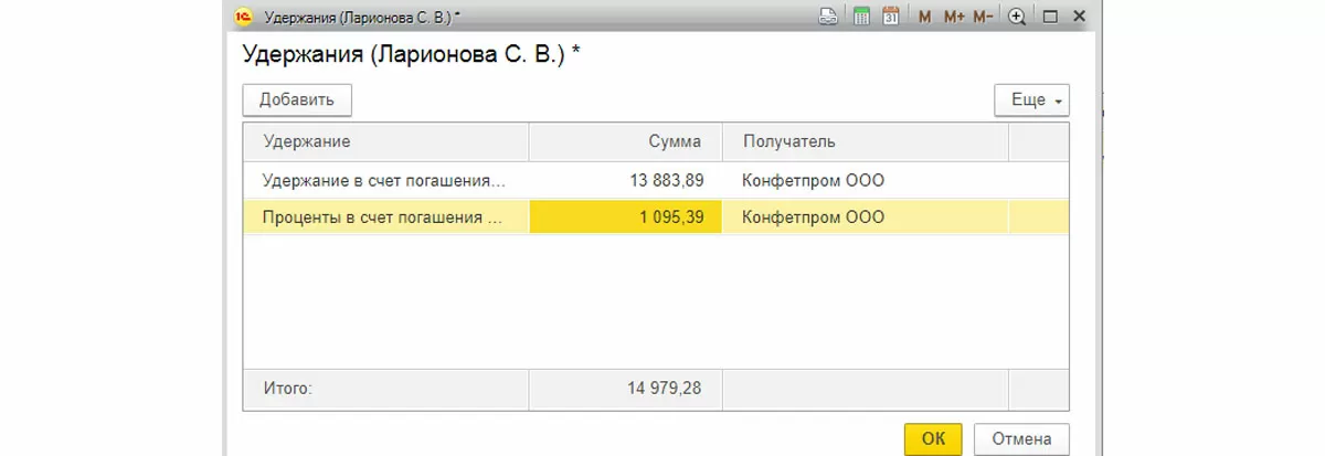 В документе «Начисление зарплаты» заполняем реквизиты. Во-первых, указываем сотрудника, из зарплаты которого будет производиться удержание. Во-вторых, при помощи кнопки «Удержать», заполняем два удержания – ежемесячный платеж и проценты.