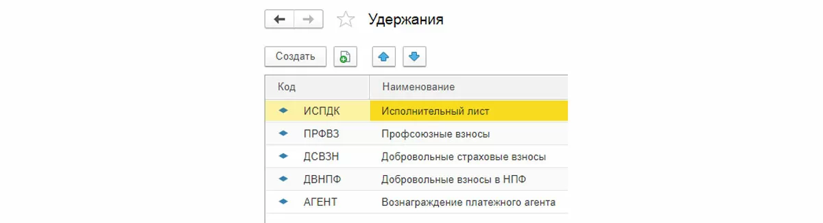 Открываем список удержаний. При помощи кнопки «Создать» добавляем новое удержание.