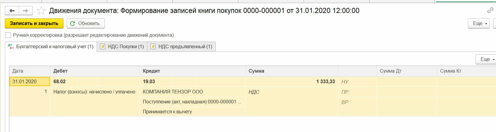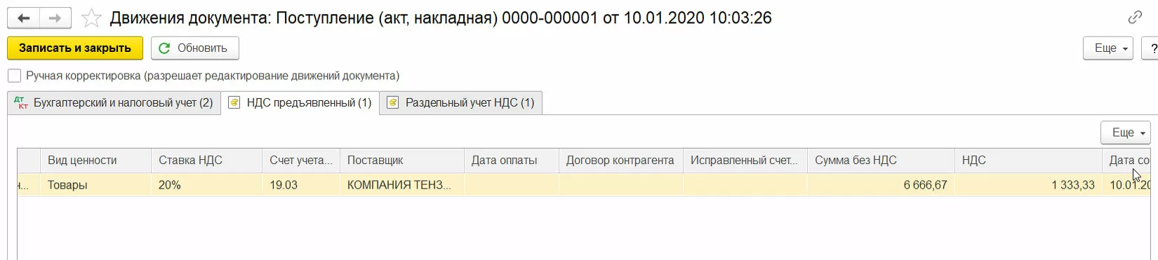 При этом будет сделана запись в регистре «НДС предъявленный», строка «Приход».