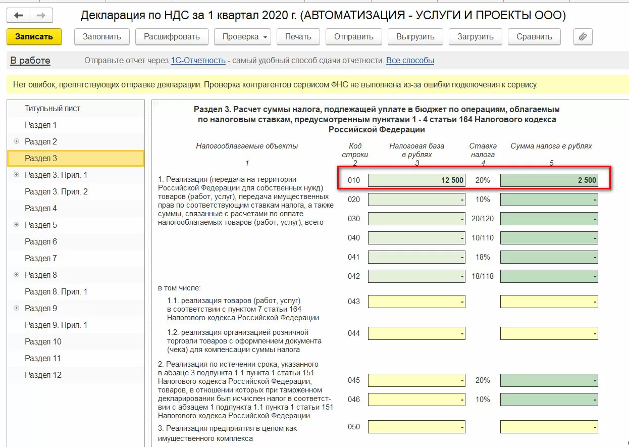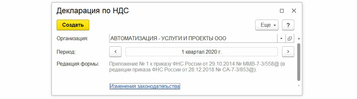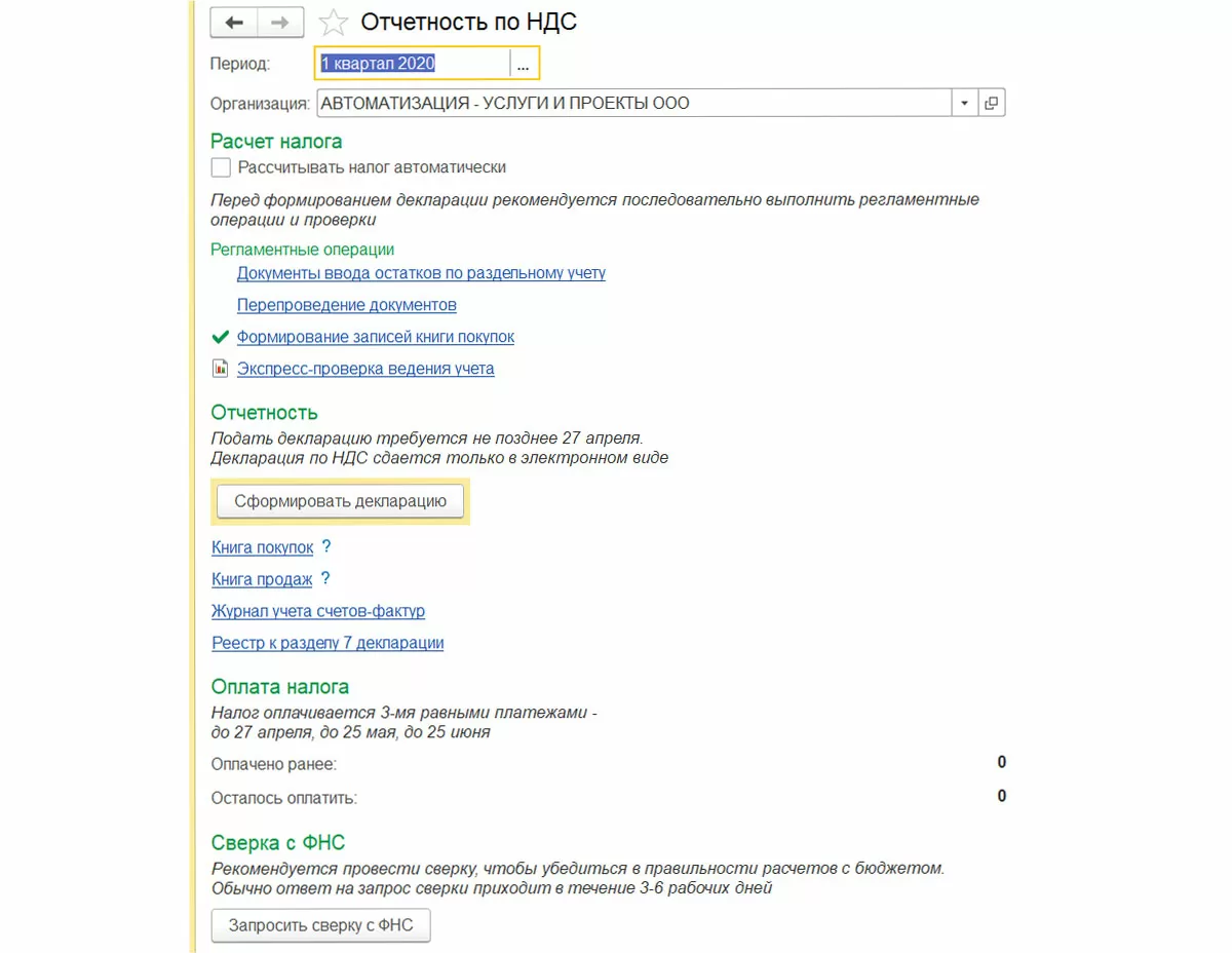 - Заполним декларацию по НДС за 1 квартал 2020 года.