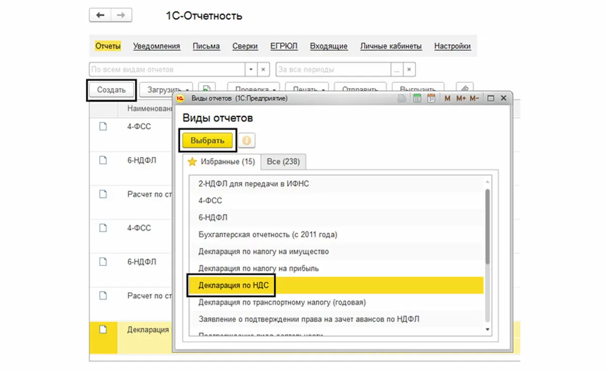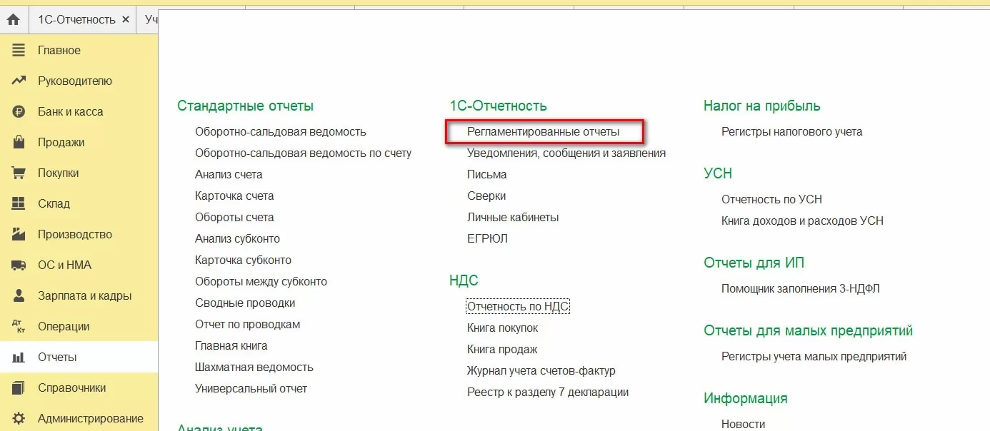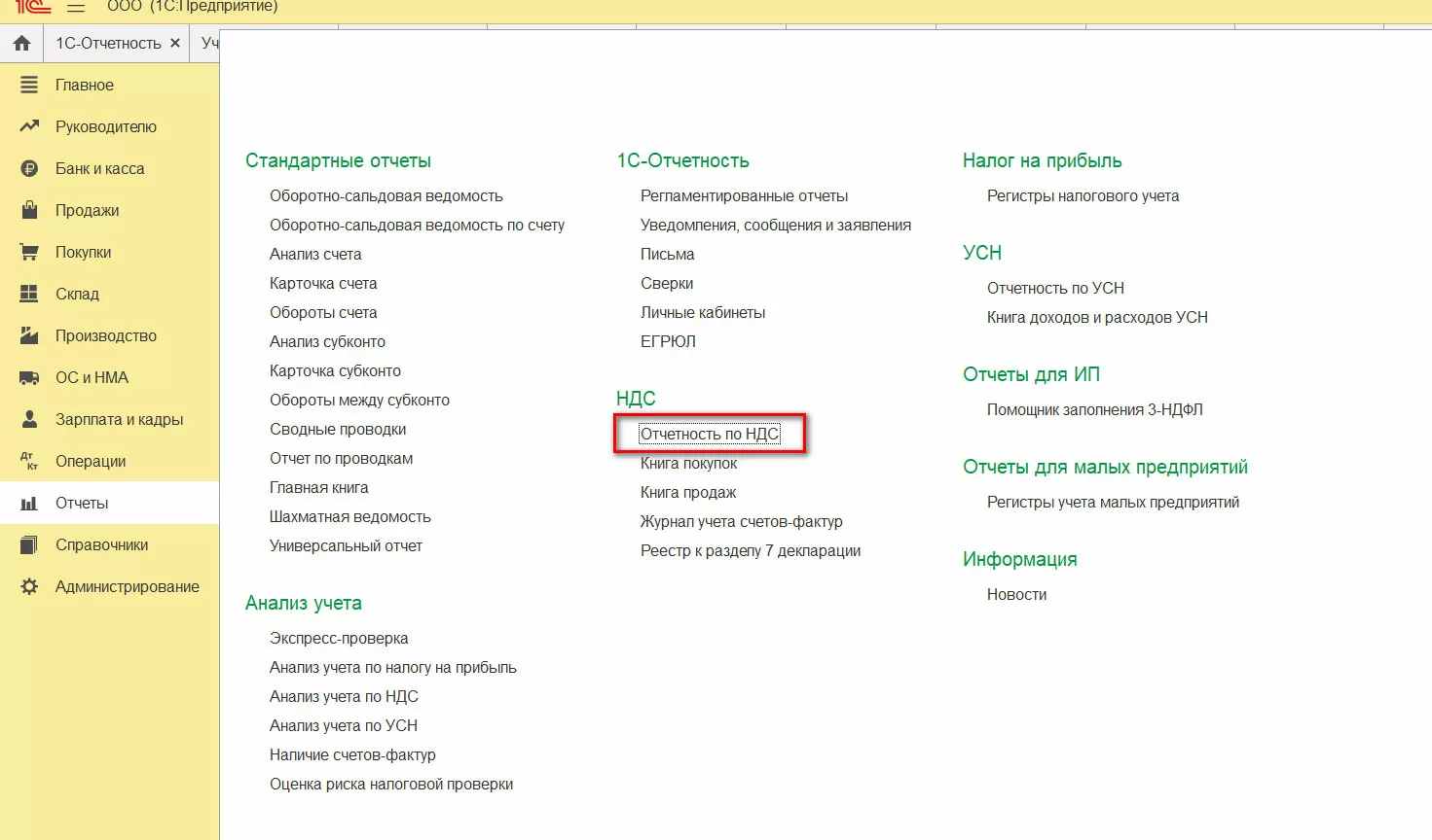 В программе «1С:Бухгалтерия 8.3» налоговая декларация по НДС также доступна в разделе «Регламентированные отчеты», пункта меню «Отчеты».