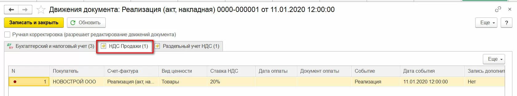 На второй закладке «Движений документа» мы видим запись в регистре «НДС Продажи», который и обеспечивает попадание реализации в «Книгу продаж».