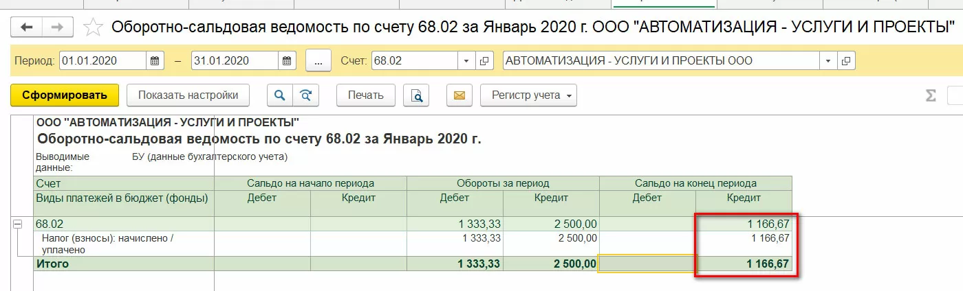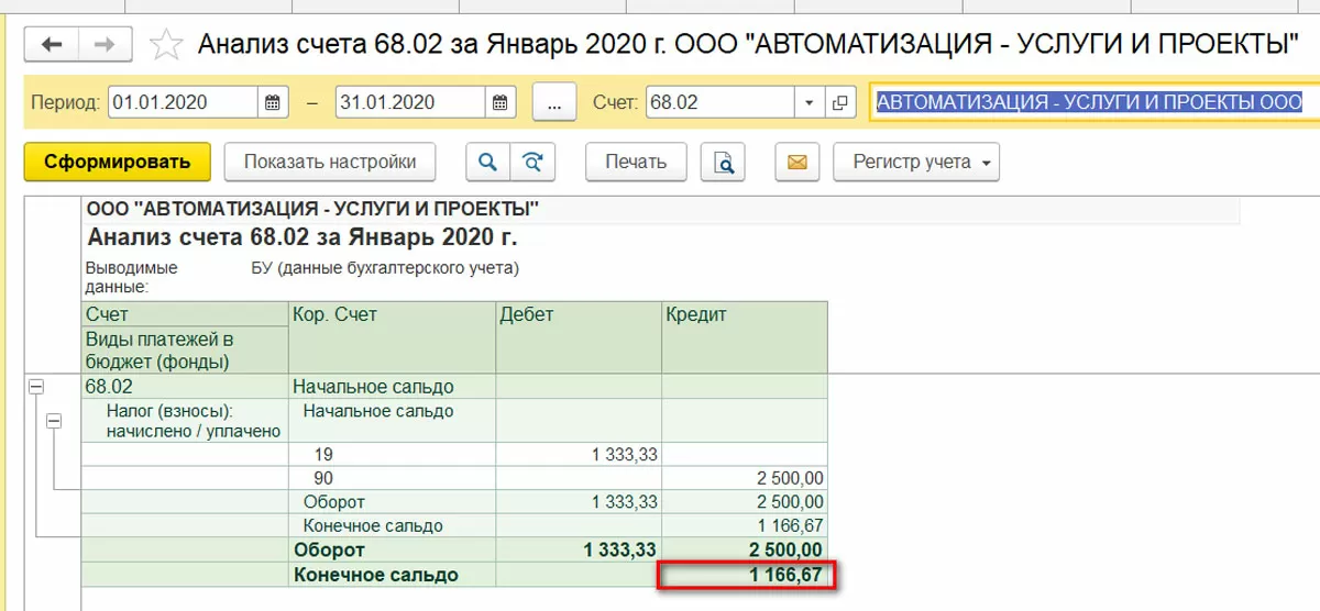 - Сальдо по кредиту счета – 1166,67 (сумма для перечисления в бюджет за 1 квартал 2020 года).