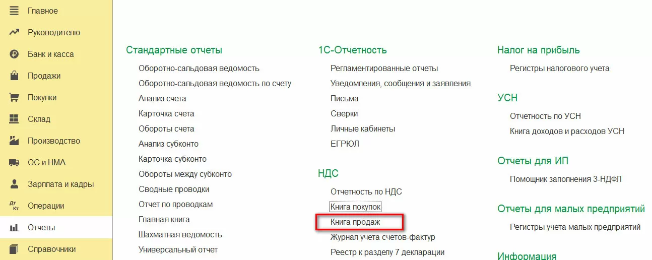 Сформируем «Книгу продаж» через пункт меню «Отчеты» - «НДС».