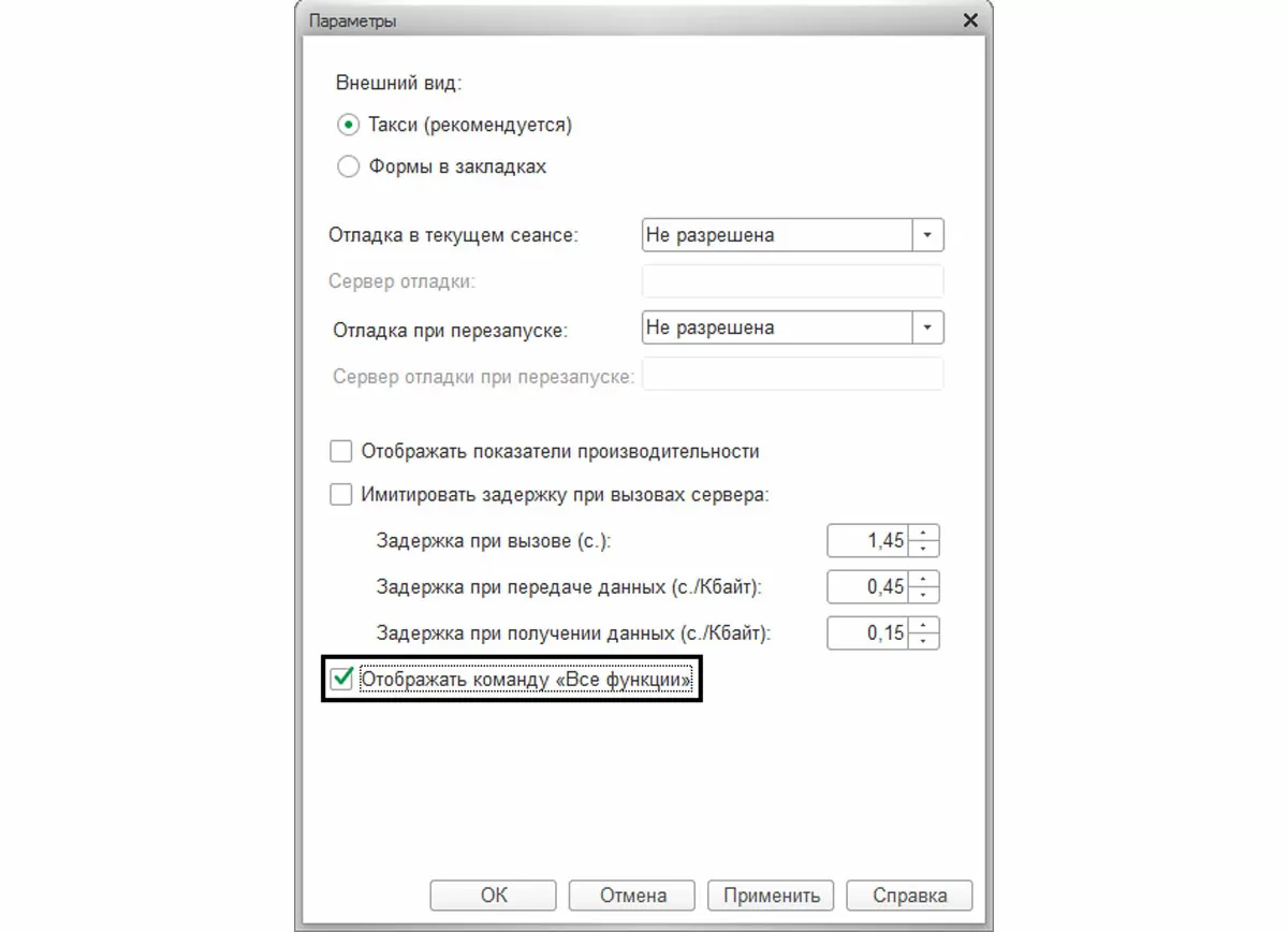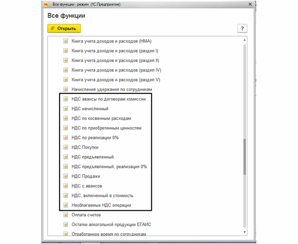 Вся информация в программе хранится в регистрах и учет НДС в «1С:Бухгалтерия 8.3» строится на регистрах накопления. Список регистров по НДС можно посмотреть, используя панель функций, открыв меню «Все функции» и раздел «Регистры накопления». Если раздел «Все функции» не видно, включить его можно в пункте меню «Сервис» - «Параметры», установив галочку «Все функции».