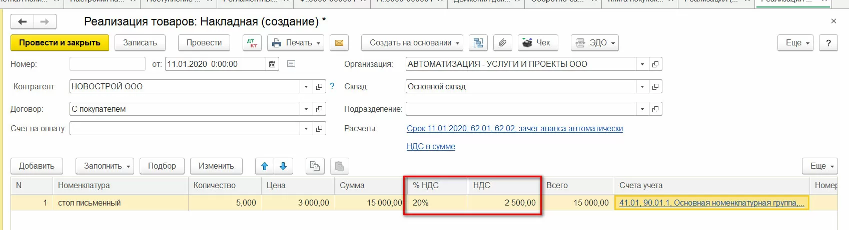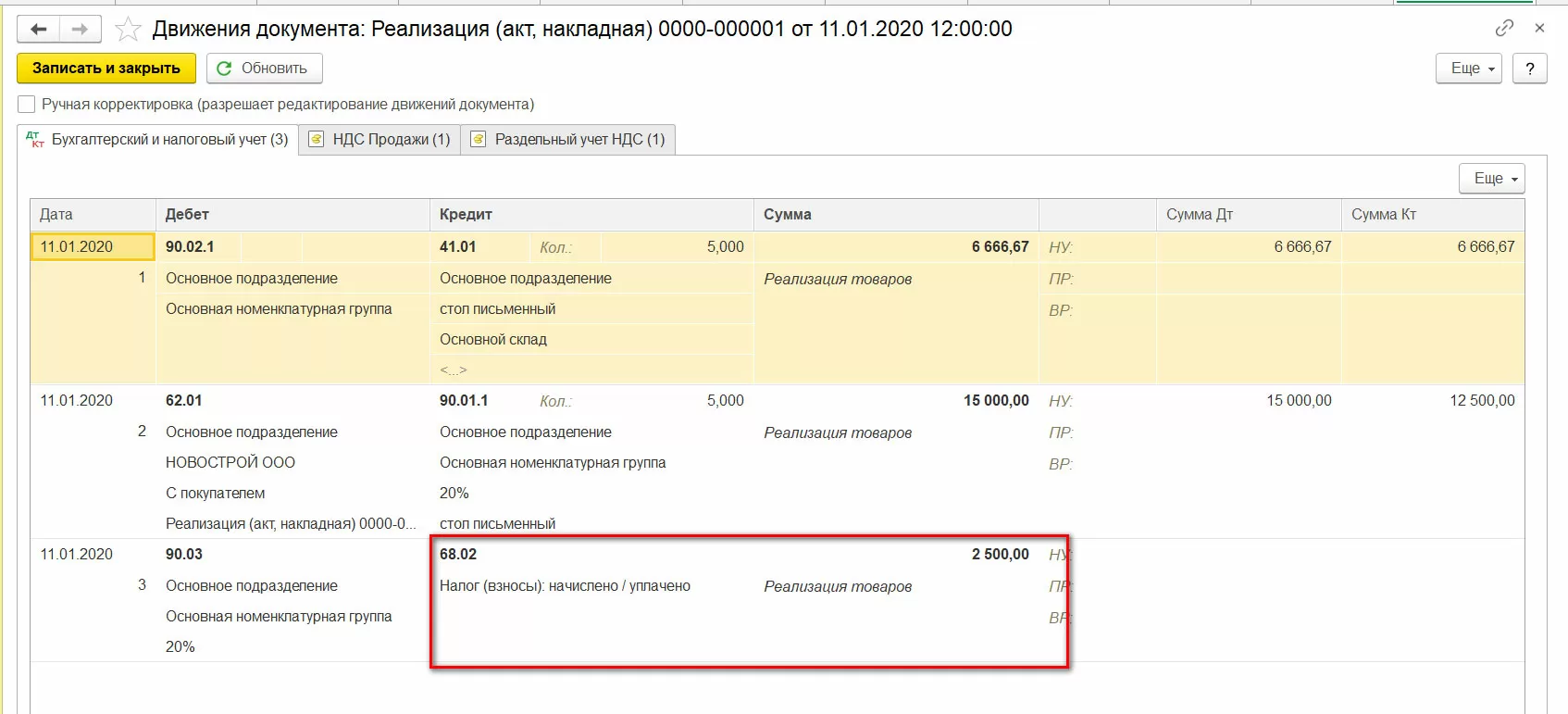 При проведении документа будут сформированы проводки и выделена сумма НДС.