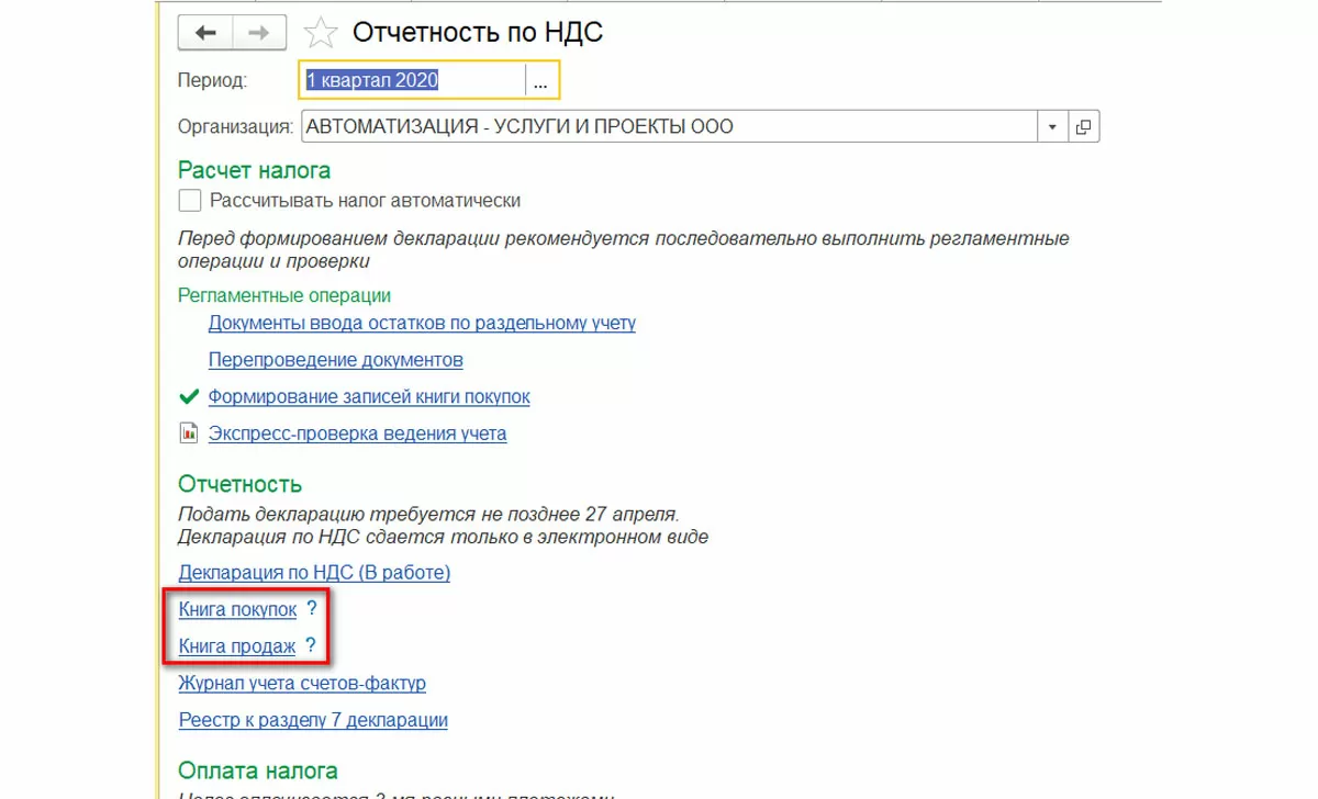 С помощью помощника по учету НДС выполняются регламентные операции по учету НДС, контролируется правильность и последовательность выполнения этих операций. Здесь же можно сделать отчеты по НДС – книгу покупок и книгу продаж, а также декларацию по НДС.