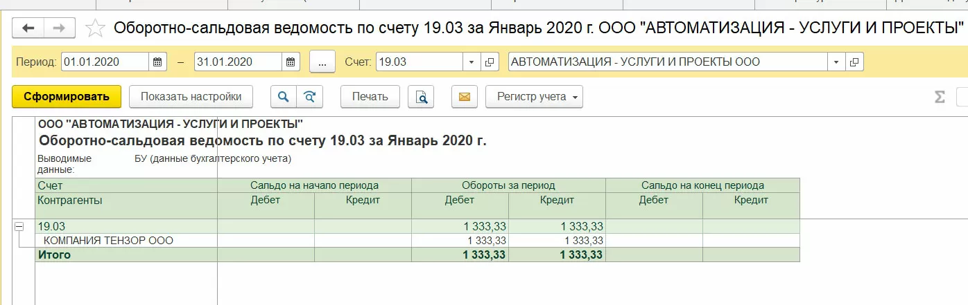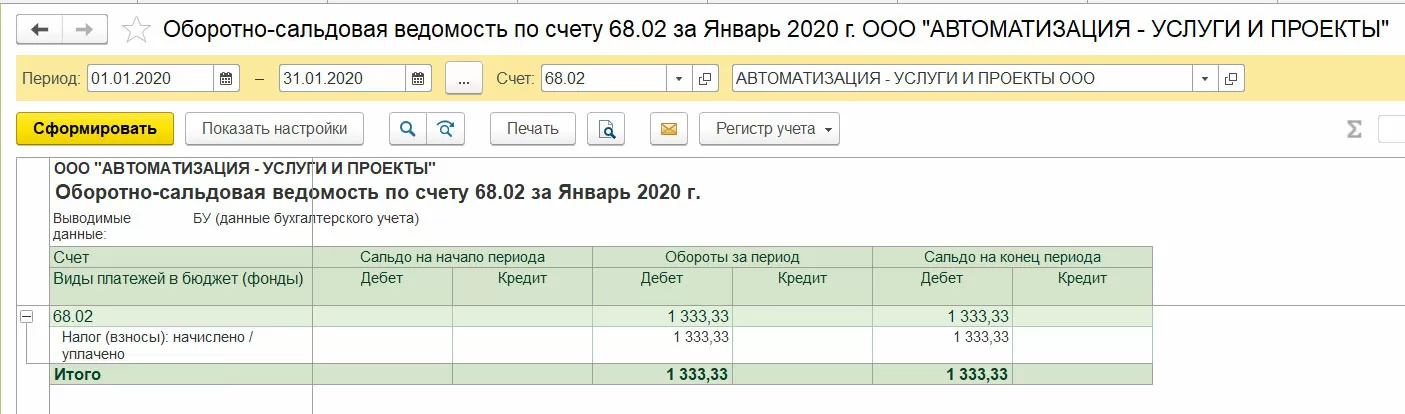 После проведения «Формирование записей книги покупок» сальдо по счету 19.03 равно 0, а по 68.02 – дебетовый остаток 1333,33 руб. т.е. бюджет нам должен на данный момент. Это можно посмотреть в отчете «Оборотно-сальдовая ведомость по счету» – 19.03 и 68.02, в пункте меню «Отчеты» из группы отчетов «Стандартные».