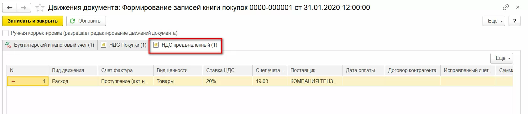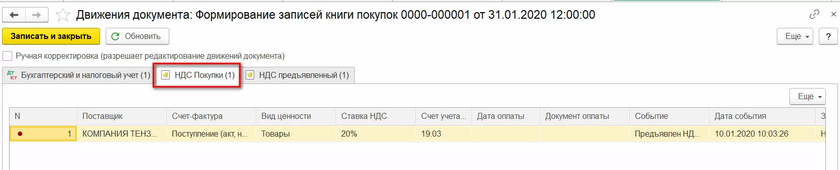 Этим же документом – «Формирование записей книги покупок», происходит запись в регистры накопления «НДС предъявленный» (строка «Расход» и запись в регистр «НДС покупки»).