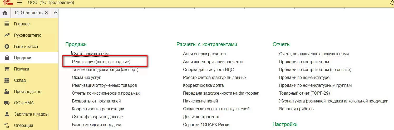 Для дальнейшего рассмотрения вопроса отразим реализацию приобретенного товара и выделим НДС – пункт меню «Продажи», а в журнале документов «Реализация (акты, накладные)» создаем новый документ.