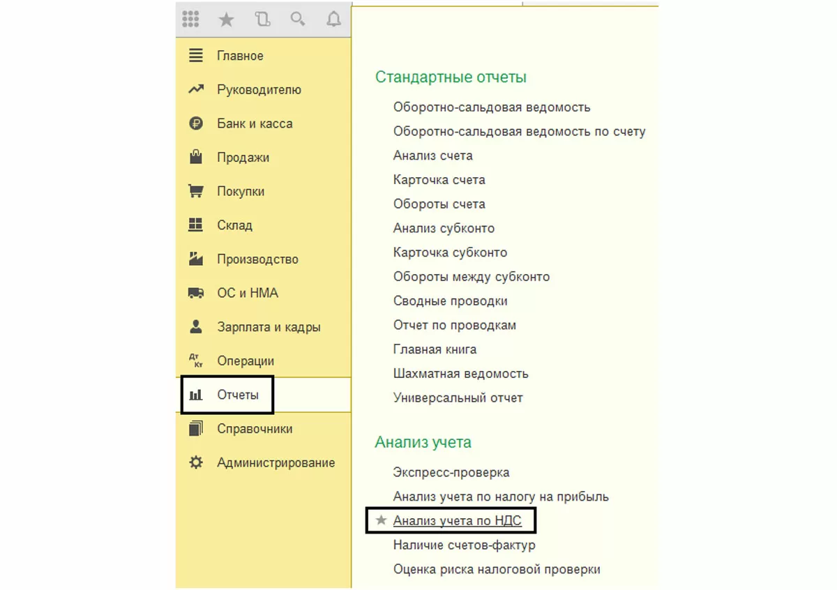 В меню «Отчеты» - «Анализ учета» доступен «Анализ учета по НДС». Сформировав отчет, мы наглядно можем увидеть картину нашей деятельности по НДС. Все ячейки расшифровываются двойным нажатием мышки.