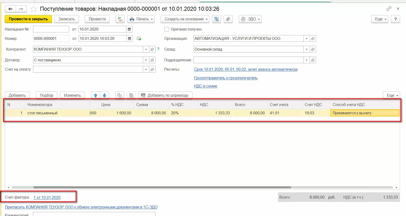 Себестоимость товара получается 6666,67 руб. (Дт. счета 41.01), НДС к зачету 1333,33 руб. (Дт. счета 19) и задолженность перед поставщиком (Кт. Счета 60.01) – 8000 руб.