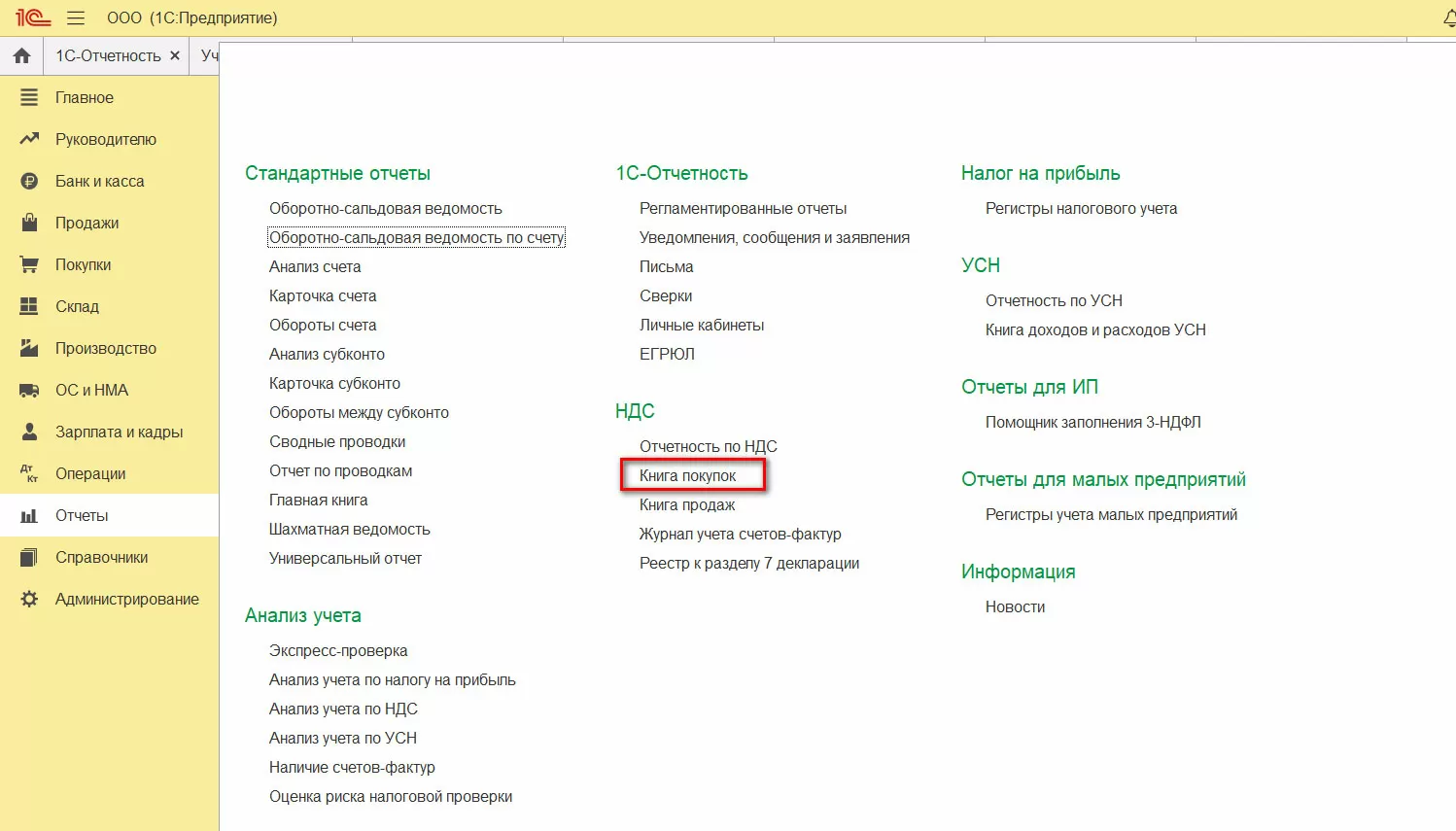 Запись в регистр «НДС предъявленный» по строке «Расход» аналогична записи в кредит счета 19 «НДС по приобретенным ценностям». Таким образом, мы приняли к вычету входящий НДС. А благодаря записи в регистр «НДС покупки» наша покупка попадет в «Книгу покупок». Сформируем ее в пункте меню «Отчеты», раздел «НДС» - «Книга покупок».