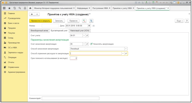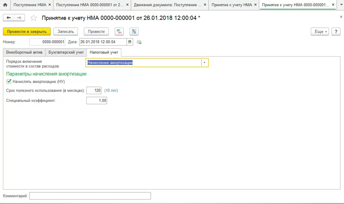 Также при принятии НМА к учету обязательно заполнение вкладки «Налоговый учет».