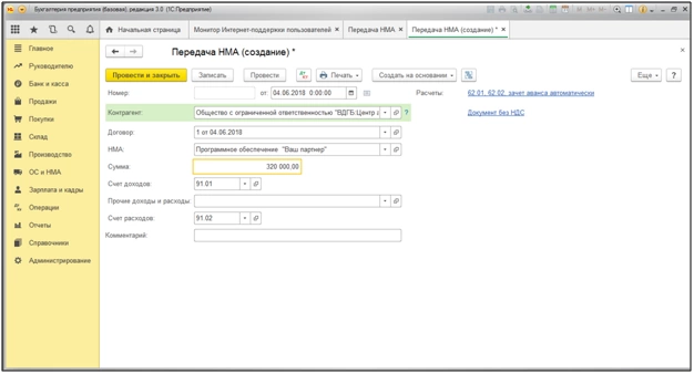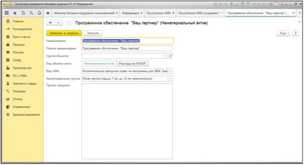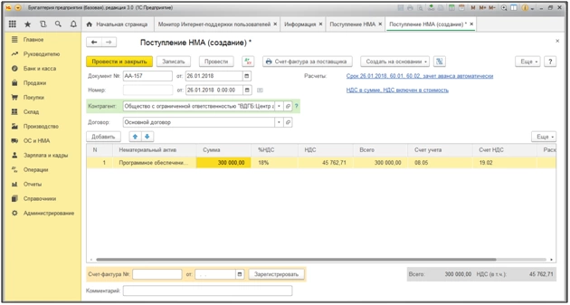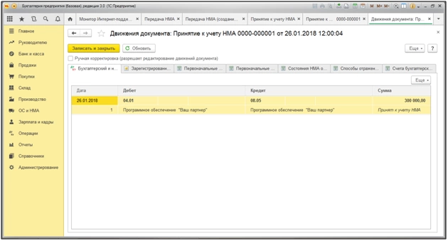 Стоимость программного обеспечения составляет 300,0 тыс. рублей. Далее нажимаем «Провести и закрыть» (Рис.7). Обращаем внимание, что программа автоматически проставила счета учета НМА 08.05 «Приобретение нематериальных активов».