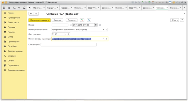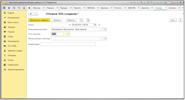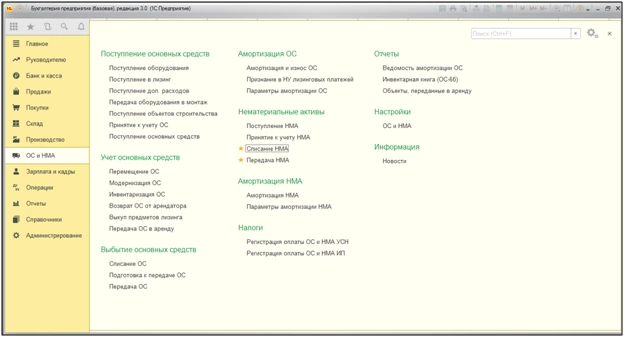 Списание, как и передача НМА, отражаются в 1С путем оформления соответствующих электронных документов: «Списание НМА» и «Передача НМА» в разделе «Нематериальные активы».