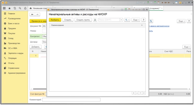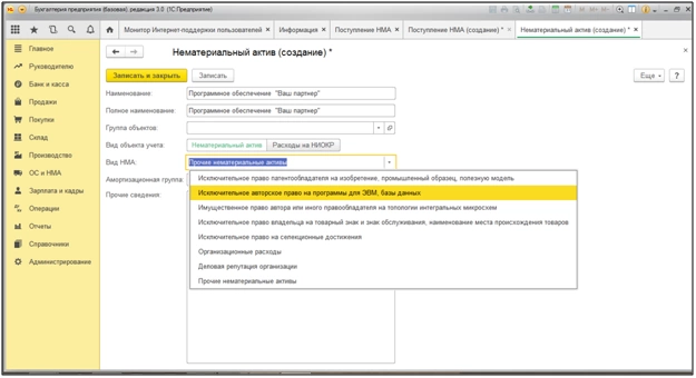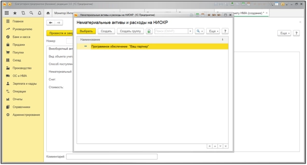 Также последовательно заполняем остальные реквизиты. При выборе нематериального актива открывается меню справочника «Нематериальные активы и расходы на НИОКР».