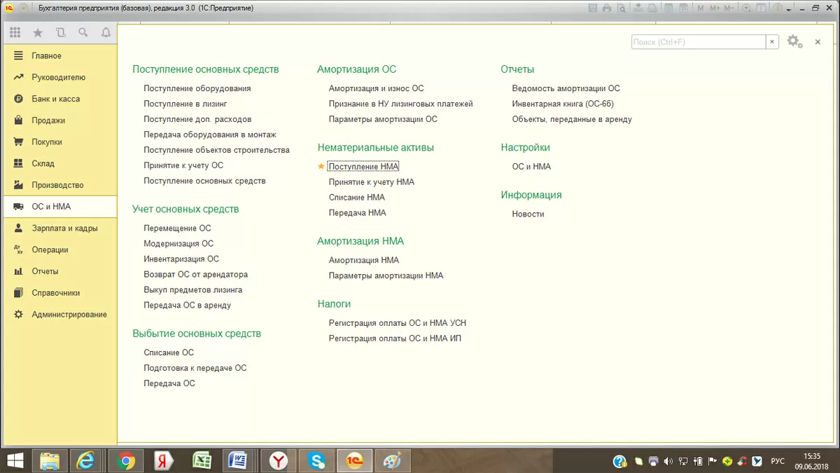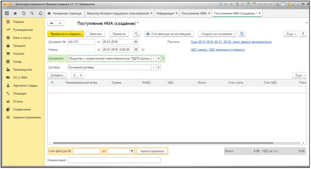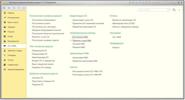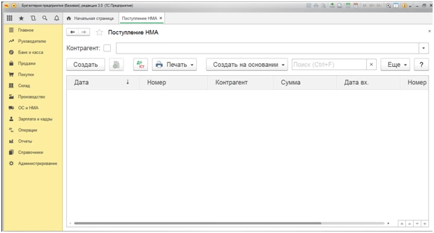 Для учета приобретения НМА перейдем в меню «ОС и НМА», далее «Нематериальные активы-Поступление НМА».