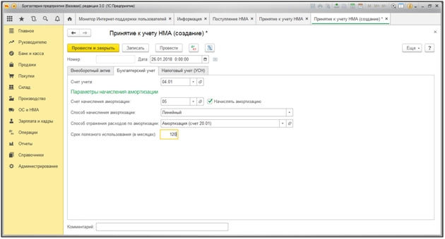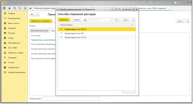 В нашем примере мы выбираем счет 20.01 «Основное производство». Срок полезного использования нами определен в размере 120 месяцев. Амортизация НМА в 1С начисляется с месяца, следующего за месяцем проведения данного документа, после осуществления регламентной операции «Закрытие месяца».
