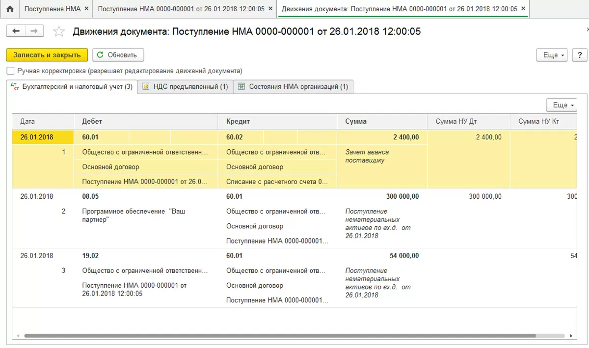 Проведение данного документа отражает лишь поступление НМА в 1С, принятие к учету НМА оформляется отдельным документом с аналогичным названием. Ниже представлен скриншот бухгалтерских проводок, формирующихся при проведении документа «Поступление НМА».