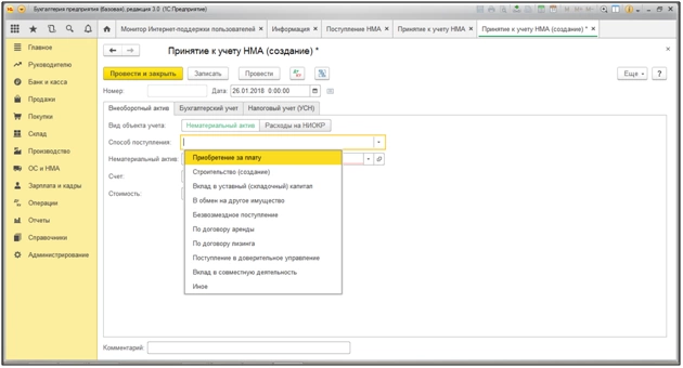 В открывшемся окне нажимаем кнопку «Создать». Во всплывшем окне заполняем дату принятия к учету НМА (как правило, это дата его приобретения), далее нажимаем строку «Способ поступления». В программе предусмотрен широкий спектр способов поступления НМА, включая вклад в уставный капитал или поступление по договору аренды. В нашем примере мы выбираем «Приобретение за плату».