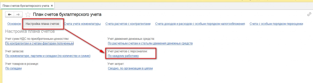 Настройки ведения аналитического учета по счету 70 устанавливают непосредственно в плане счетов в меню «Настройки плана счетов», подменю «Учет расчетов с персоналом».
