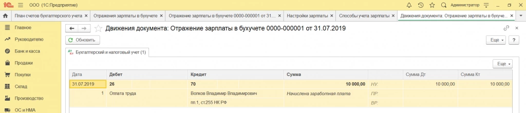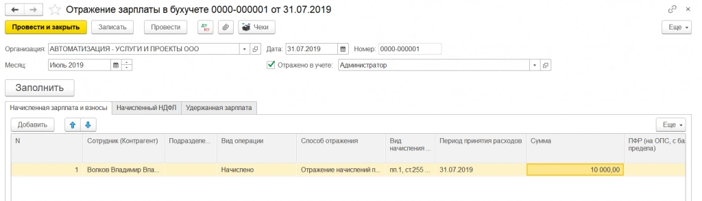 В документ «Отражение зарплаты в бухучете» загружается следующая информация: