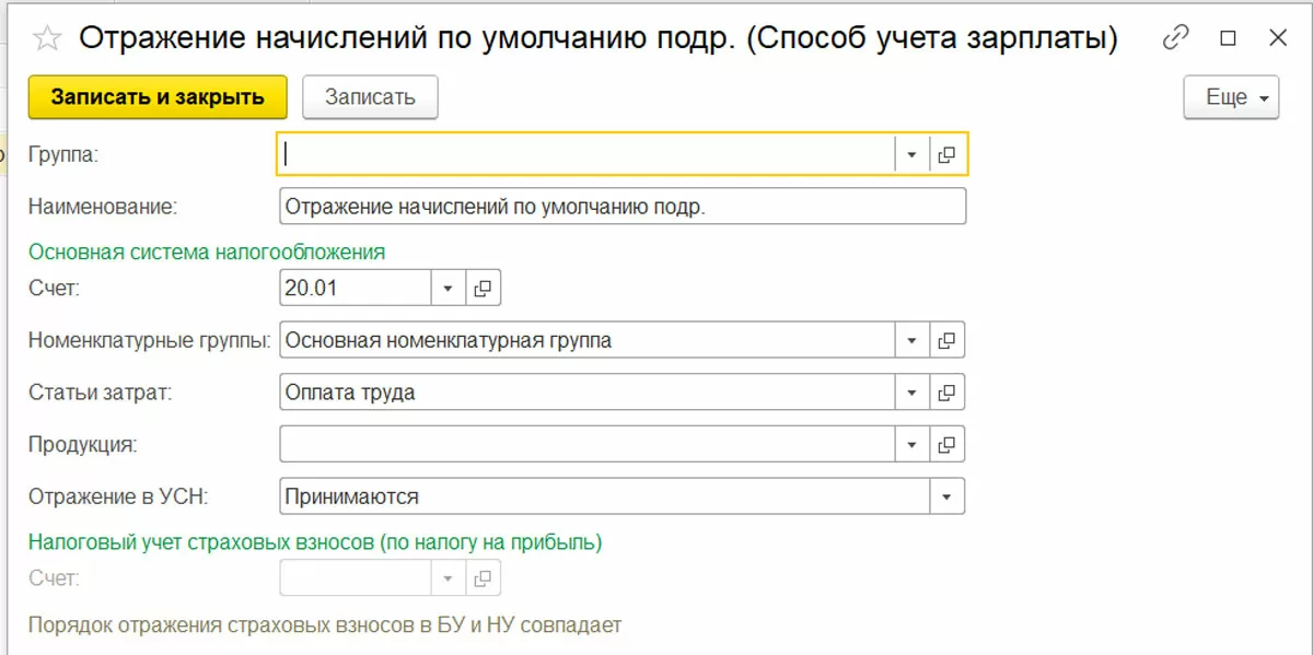 - Ввести информацию о порядке отражения страховых взносов в НУ (если не совпадает с БУ).
