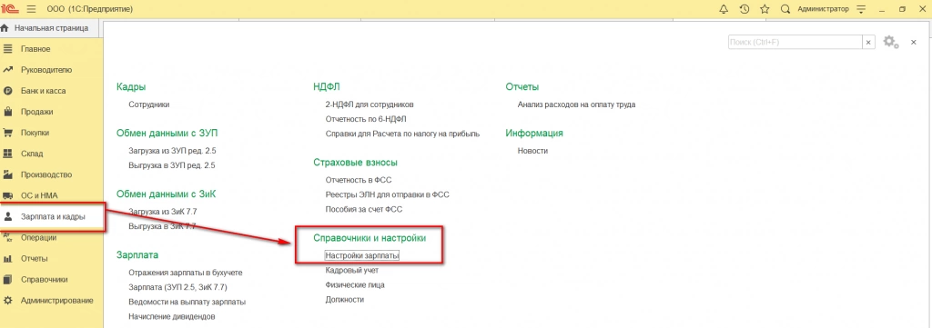 Справочник «Способы учета зарплаты» доступен для настройки в меню «Зарплата и кадры», подменю «Справочники и настройки» - «Настройки зарплаты».