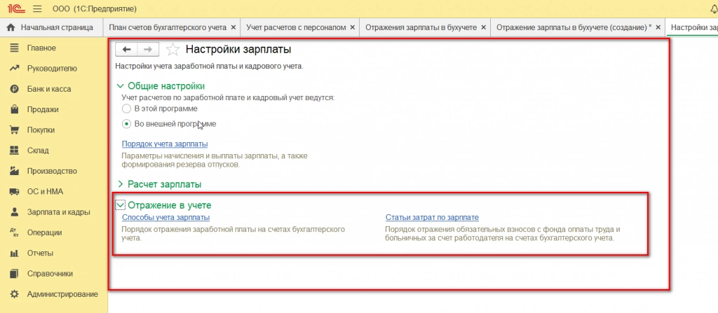 Выбор ведения учета (в этой или во внешней программе) в 1С:Бухгалтерия осуществляется в разделе «Зарплата и Кадры» меню «Справочники и настройки» - «Настройка зарплаты».