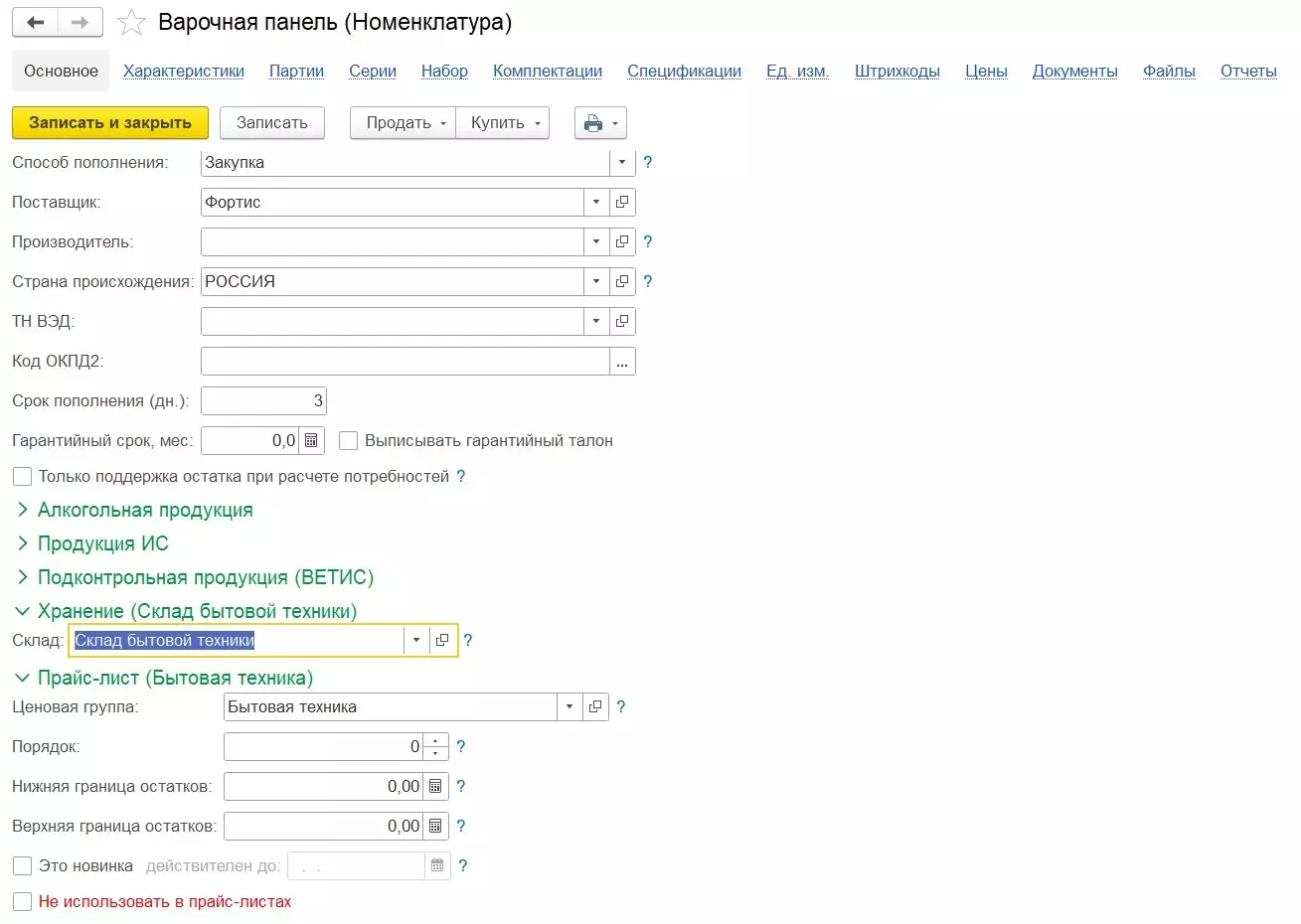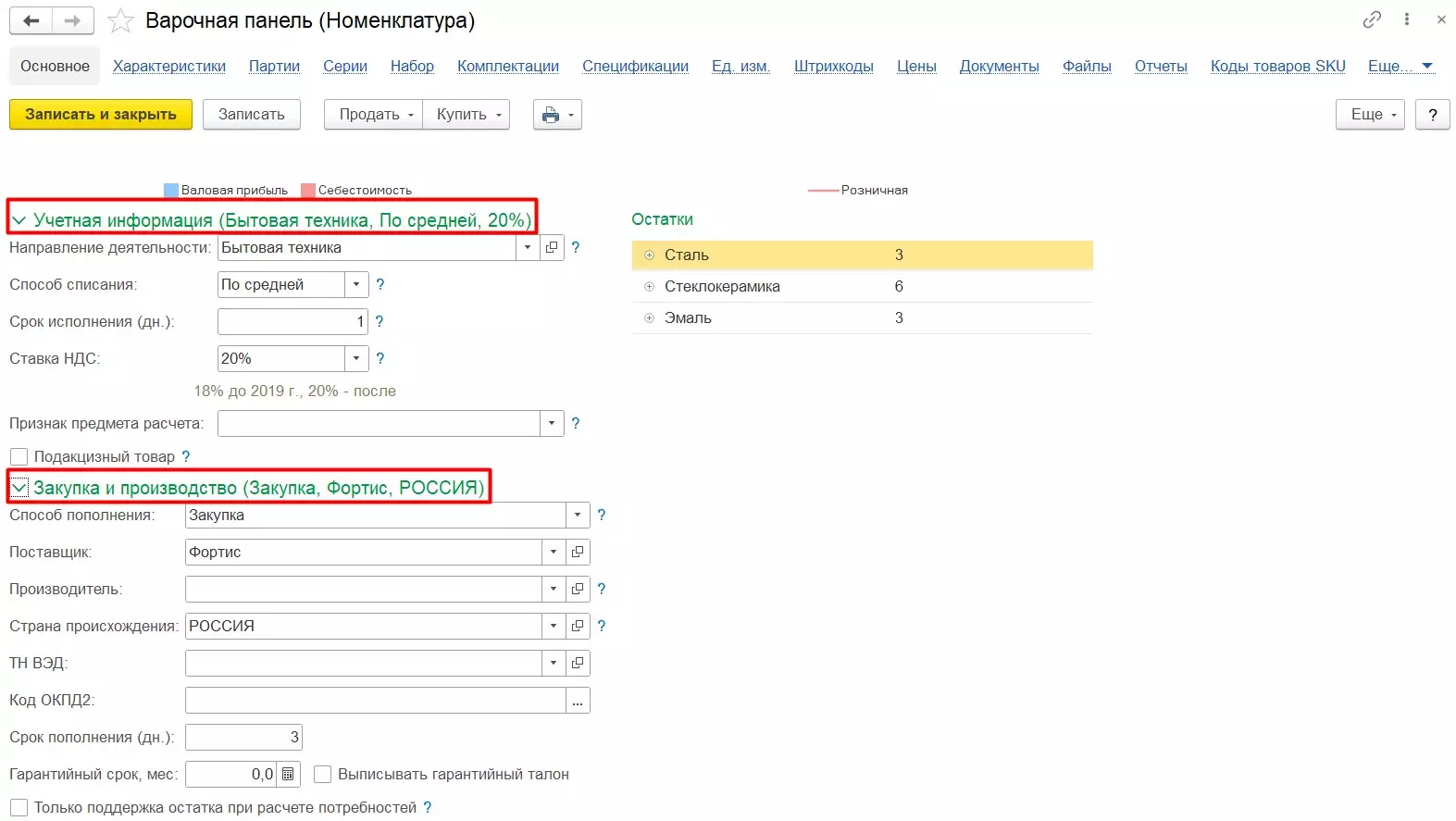 В группе Закупка и производство указываются: