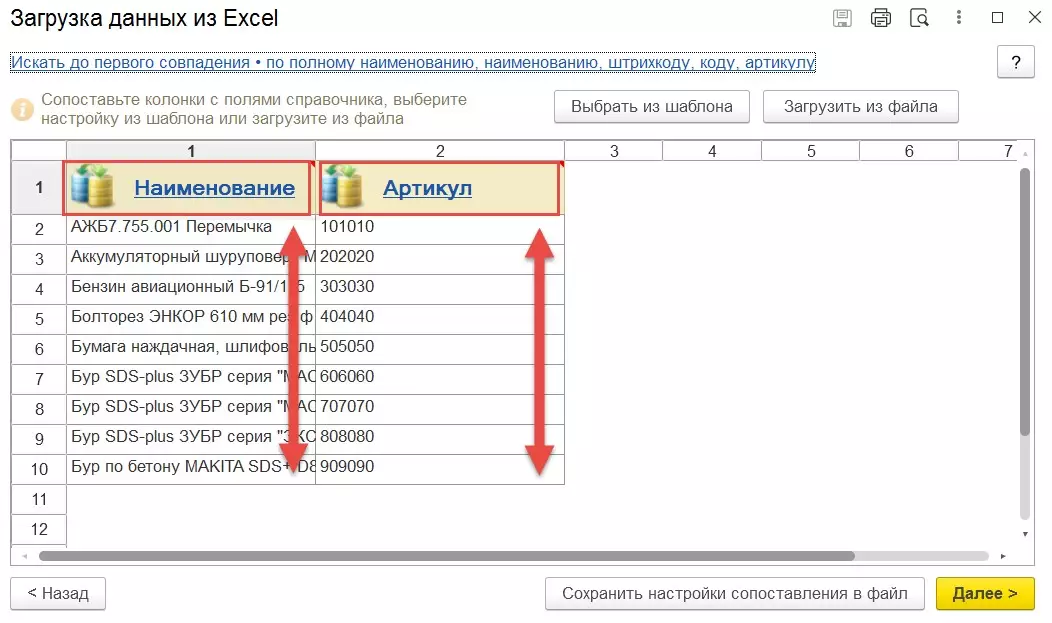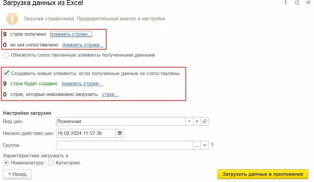 Следующим шагом программа проводит проверку на наличие соответствий среди текущих значений справочника и загружаемых. При отсутствии успешного сопоставления могут быть сразу же созданы новые элементы.