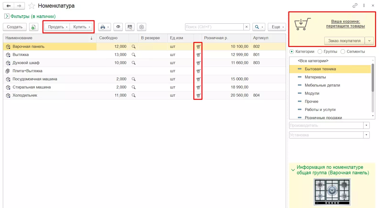 Также документы можно создать, воспользовавшись кнопками Продать или Купить в верхней части списка номенклатуры, предварительно выделив в списке необходимый элемент.