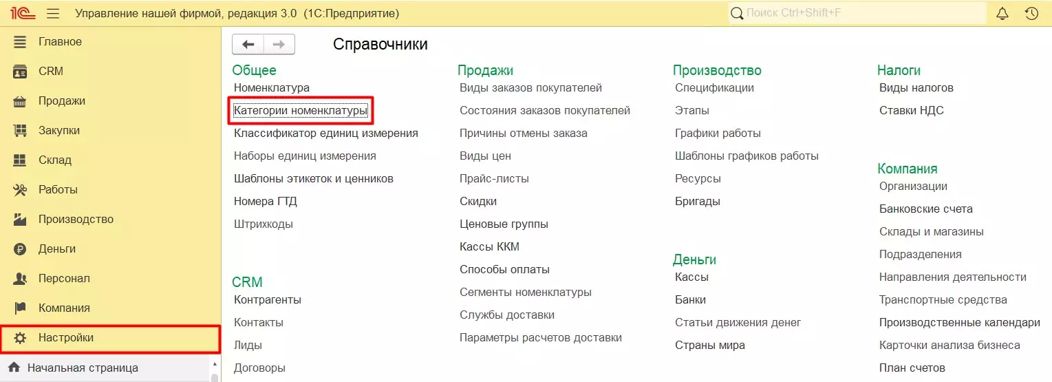Первоначально необходимо создать категории номенклатуры. Категории номенклатуры предназначены для объединения номенклатурных позиций, близких по своим свойствам и характеристикам, определяет дальнейшие разрезы учета товаров. Категория присваивается каждой номенклатуре для систематизации товаров. Категории номенклатуры доступны в разделе Настройки – Все справочники – Категории номенклатуры.