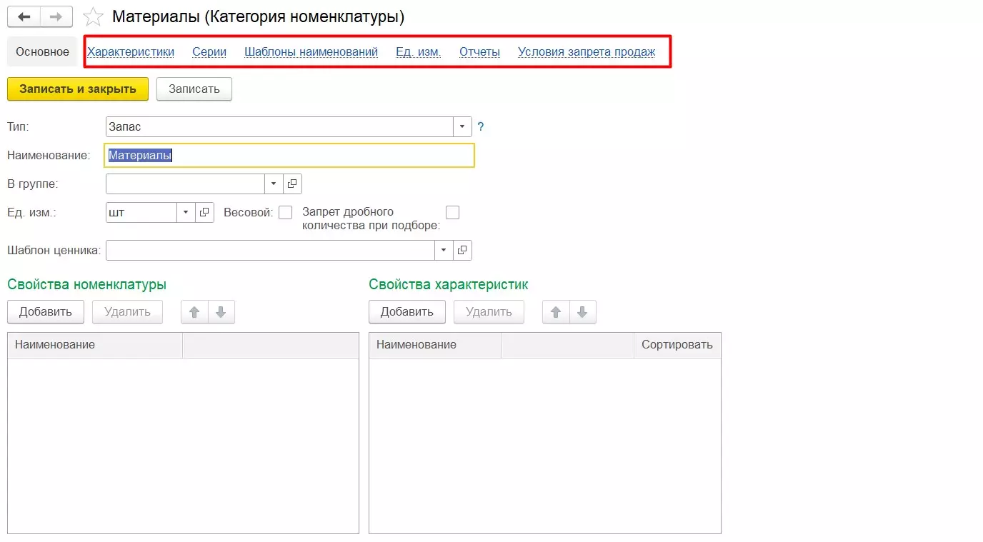 В категории доступно создание дополнительных реквизитов для номенклатуры и характеристик (при использовании) для указания вспомогательной информации.