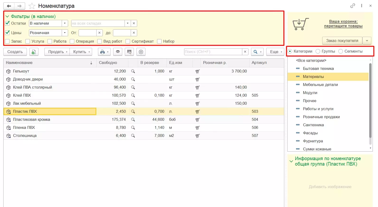Для номенклатуры доступно формирование сегментов. Использование сегментов упрощает работу с ценообразованием и скидками, обеспечивает быстрый подбор в документы, позволяет формировать отчеты.