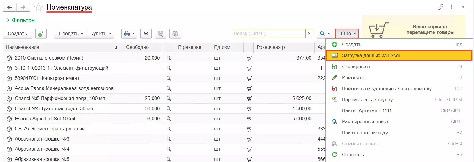 В правом верхнем углу отображается Корзина, которая позволяет упростить оформление любого документа, отражающего движение номенклатуры. Добавление номенклатуры в корзину производится путем нажатия на специальную иконку напротив товара. При добавлении товара в корзину можно указать количество и цену, если включена соответствующая настройка.