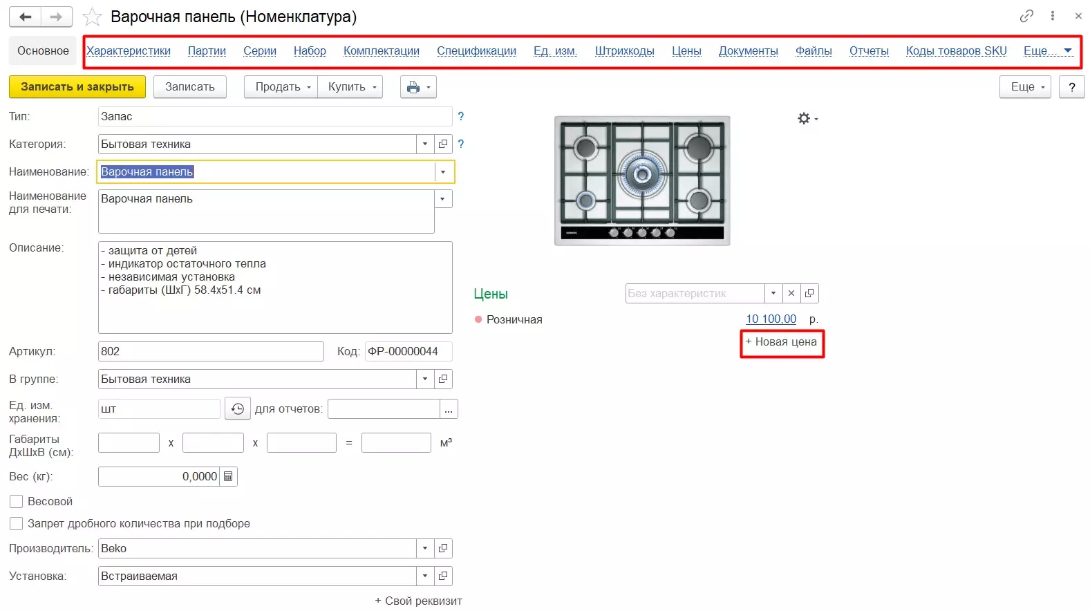 При необходимости можно указать штрихкоды и цены номенклатуры, просмотреть документы, где используется данная позиция. По гиперссылке Еще можно перейти к управлению запасами, заполнению номенклатуры поставщиков, аналогов и счетов учета.