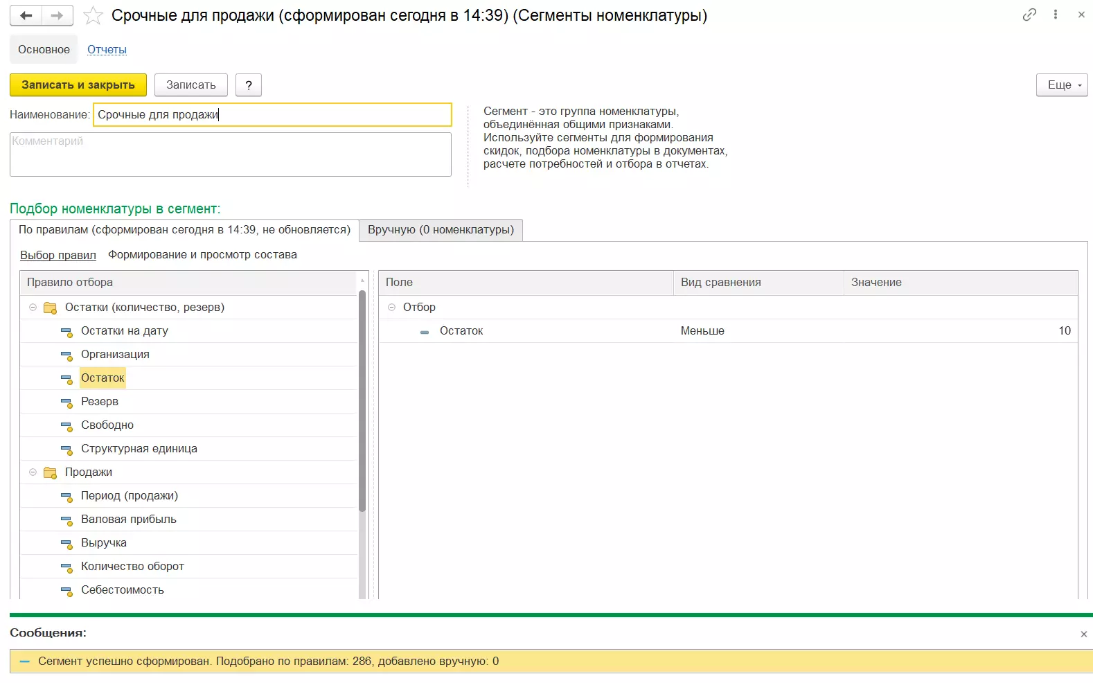 Формирование сегментов доступно в разделе Продажи - Сервис - Сегменты номенклатуры. Сегмент можно формировать автоматически в зависимости от различных параметров (остаток товара, значение валовой прибыли, цена, и т.д.) и реквизитов номенклатуры. При необходимости пользователь может сформировать сегмент вручную.