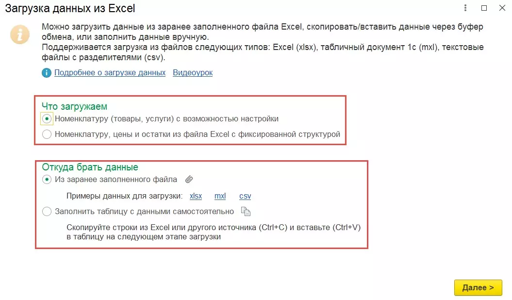 А также выбор источника загрузки данных: