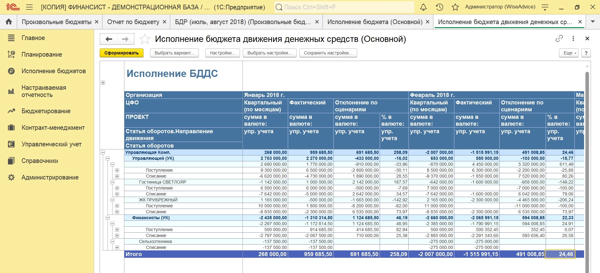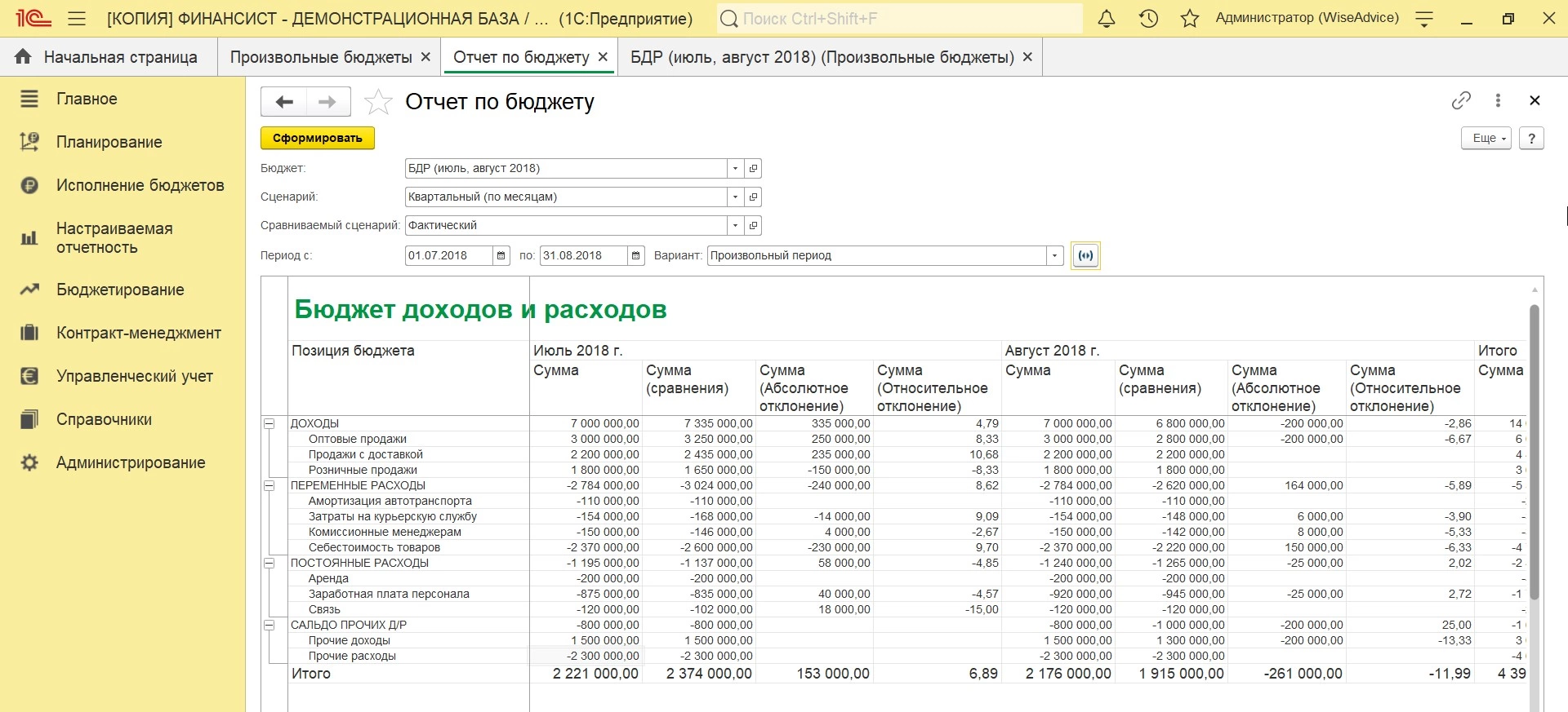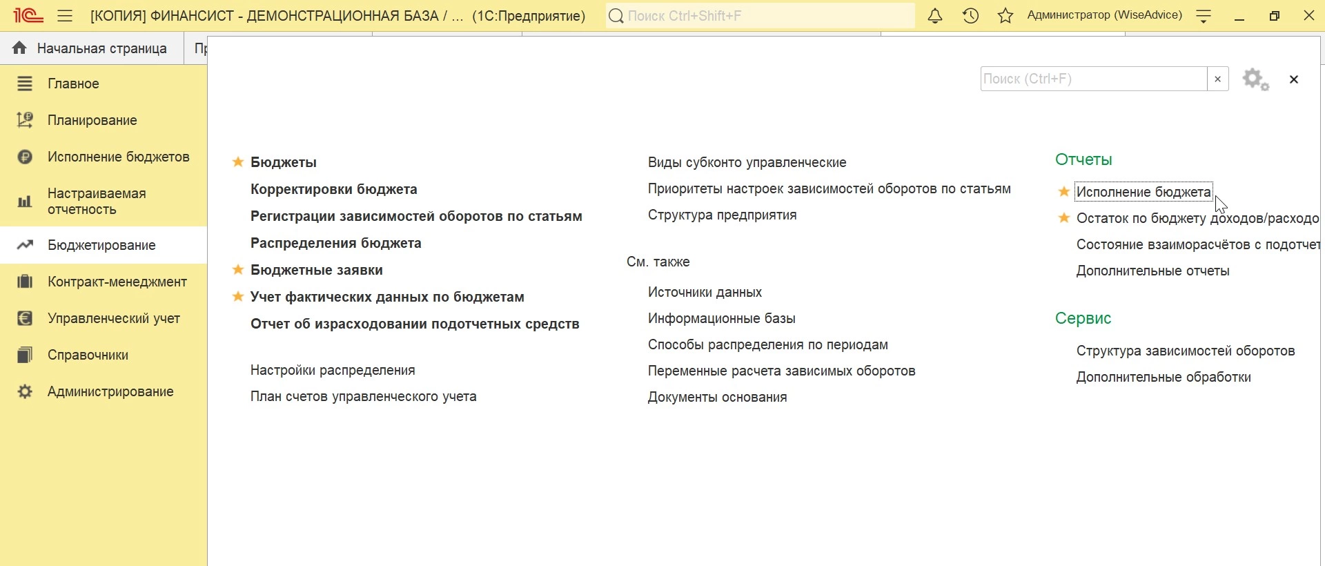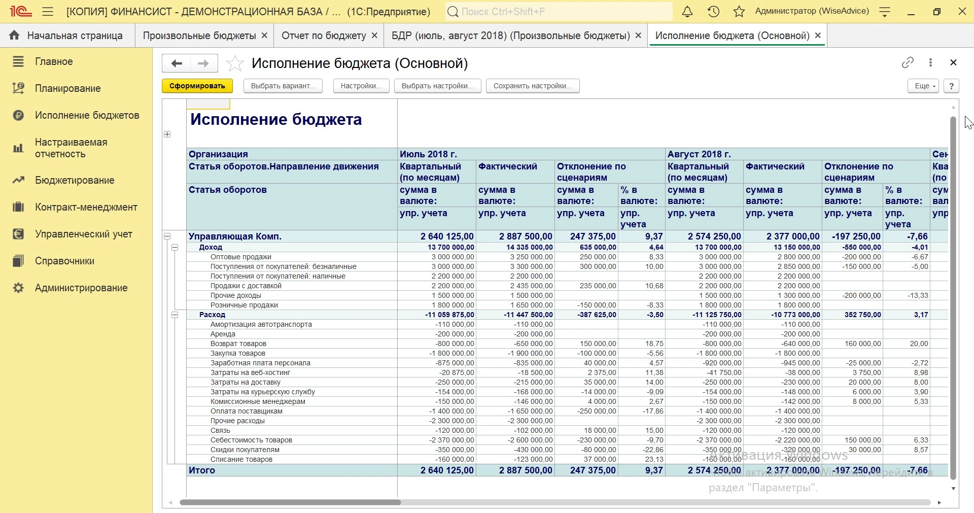 Современное решение WA:Финансист для управленческого учета, типовое внедрение за 1 мес.Кроме того, Отчет (Бюджет) доходов и расходов можно сформировать путем стандартных отчетов в разделе Бюджетирование-Исполнение бюджета и нажимаем кнопку сформировать