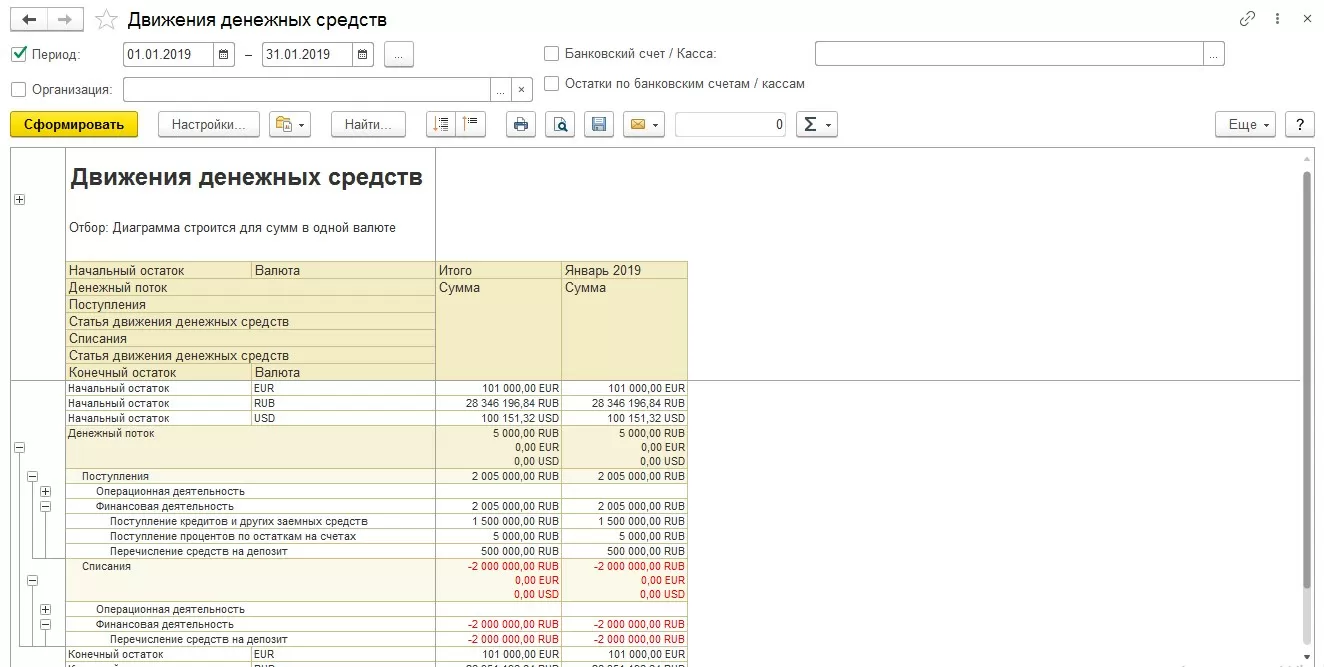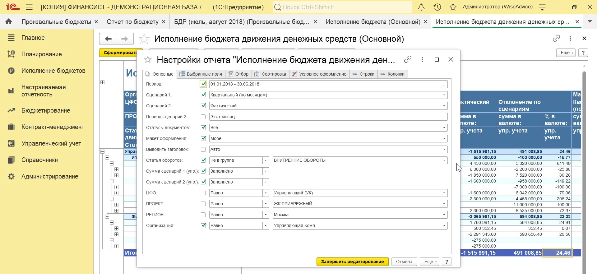 В разделе «Настройки» можно гибко управлять детализацией отчета – формировать его в разрезе любых доступных аналитик, по группе компаний, по любому ЦФО, организации и т.д.