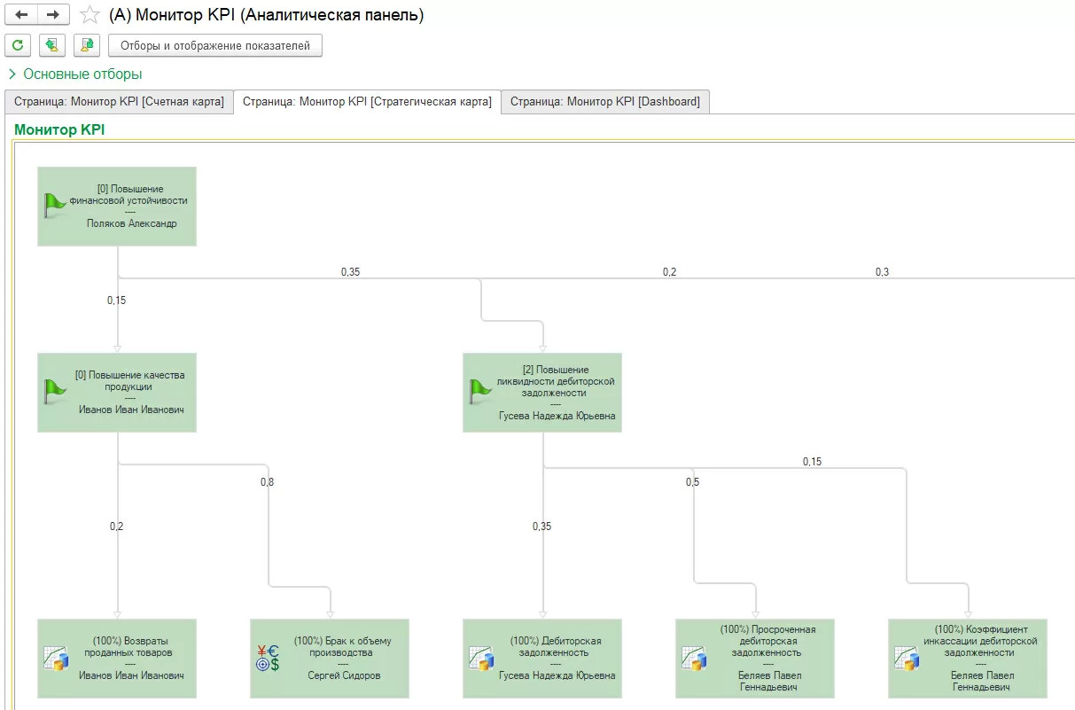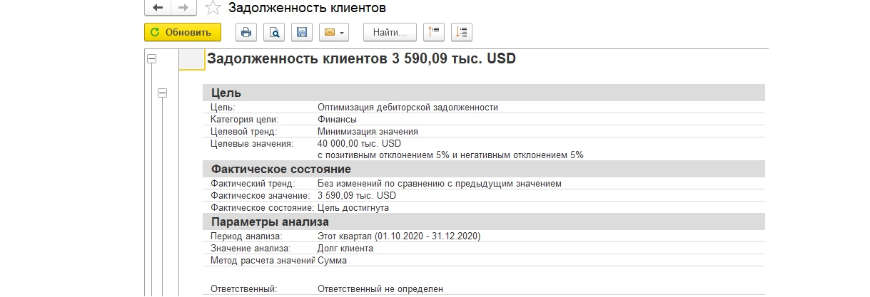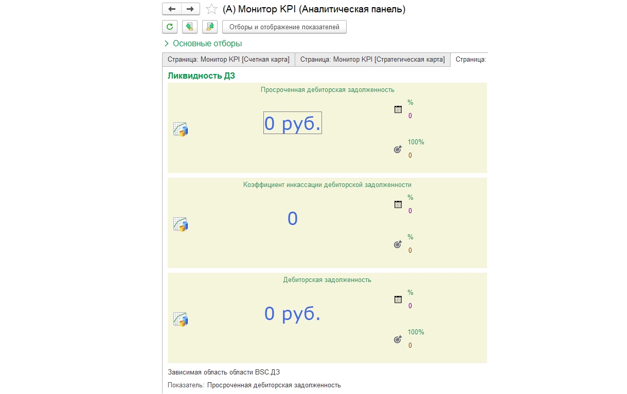 Системы для учета и финансового управления 1С содержат все необходимые инструменты для работы с ДЗ. В 1С:ERP 2 для этих целей можно использовать Монитор целевых показателей, где отображаются запрашиваемые данные не только в числовом, но и графическом формате.