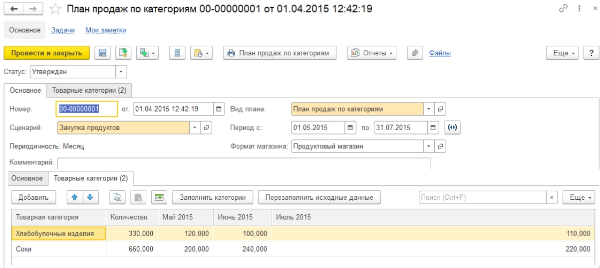 Среднесрочное планирование осуществляется через «Планы продаж». Укрупненное планирование («Планы продаж по категориям») осуществляется в разрезе товарных категорий в суммовом выражении с возможностью детализации до месяца. Чтобы планировать и в суммовом, и в количественном выражении, «План по категориям» можно детализировать до номенклатуры («План продаж по номенклатуре»).