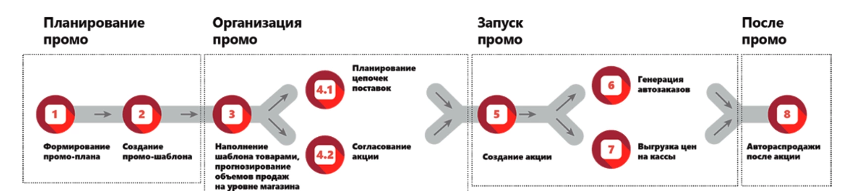Для оценки потенциальных клиентов и различных маркетинговых мероприятий предусмотрены инструменты «Маркетинговые мероприятия» и «Сделки», которые позволяют реализовать все этапы процедуры проведения «Маркетинговых (Промо) мероприятий»: планирование, организация, запуск, постпромо.