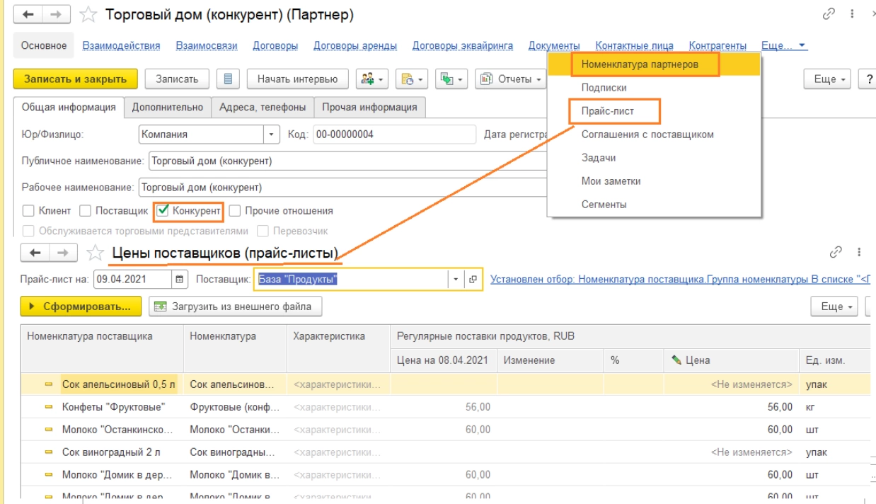 Механизм «Конкурентной разведки» дает возможность мониторинга ассортимента конкурентов и их цен. Конкурентов регистрируют в классификаторе «Партнеры» с указанием соответствующего признака. Для конкурента можно задать список ассортимента номенклатуры и указать цены, посредством АРМ «Цены поставщиков (Прайс-листы)».