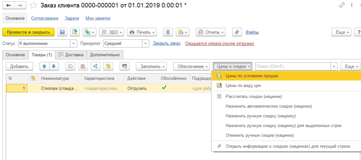 - Номенклатурный состав заказа и цены на нее. Цены и скидки в заказе клиента формируются автоматом на основании указанного вида цен, но могут быть и скорректированы вручную.